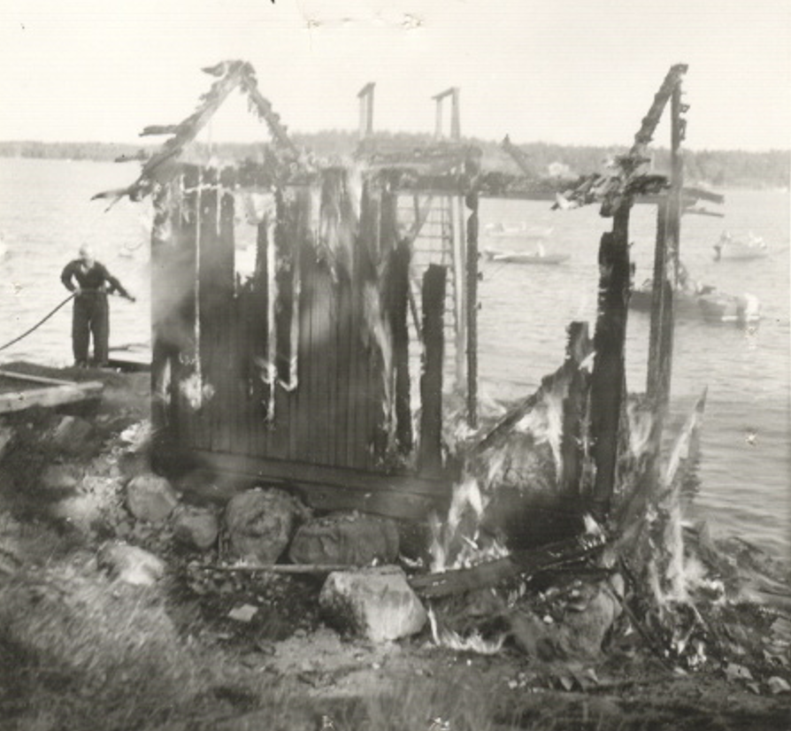 NN hade tillsammans med några kamrater vid 15.00-tiden gjort upp eld i bastun. Efter att ha tänt i kaminen och fyllt densamma med ved gick de hem till sina resp. stugor för att hämta tvål och handduk. När de sedan omkring klockan 15.30 återvände till bastun och öppnade dörren till bastun slog stora eldslågor ut genom dörren. De försökte då släcka elden med vatten, som de tog från sjön. NN sprang själv hem efter en brandspruta. Det visade sig dock att de ej heller med denna kunde släcka elden, varför de ringde brandkåren. NN ansåg, att elden uppstått genom överhettning från kaminen. Bastun var ej brandförsäkrad.
