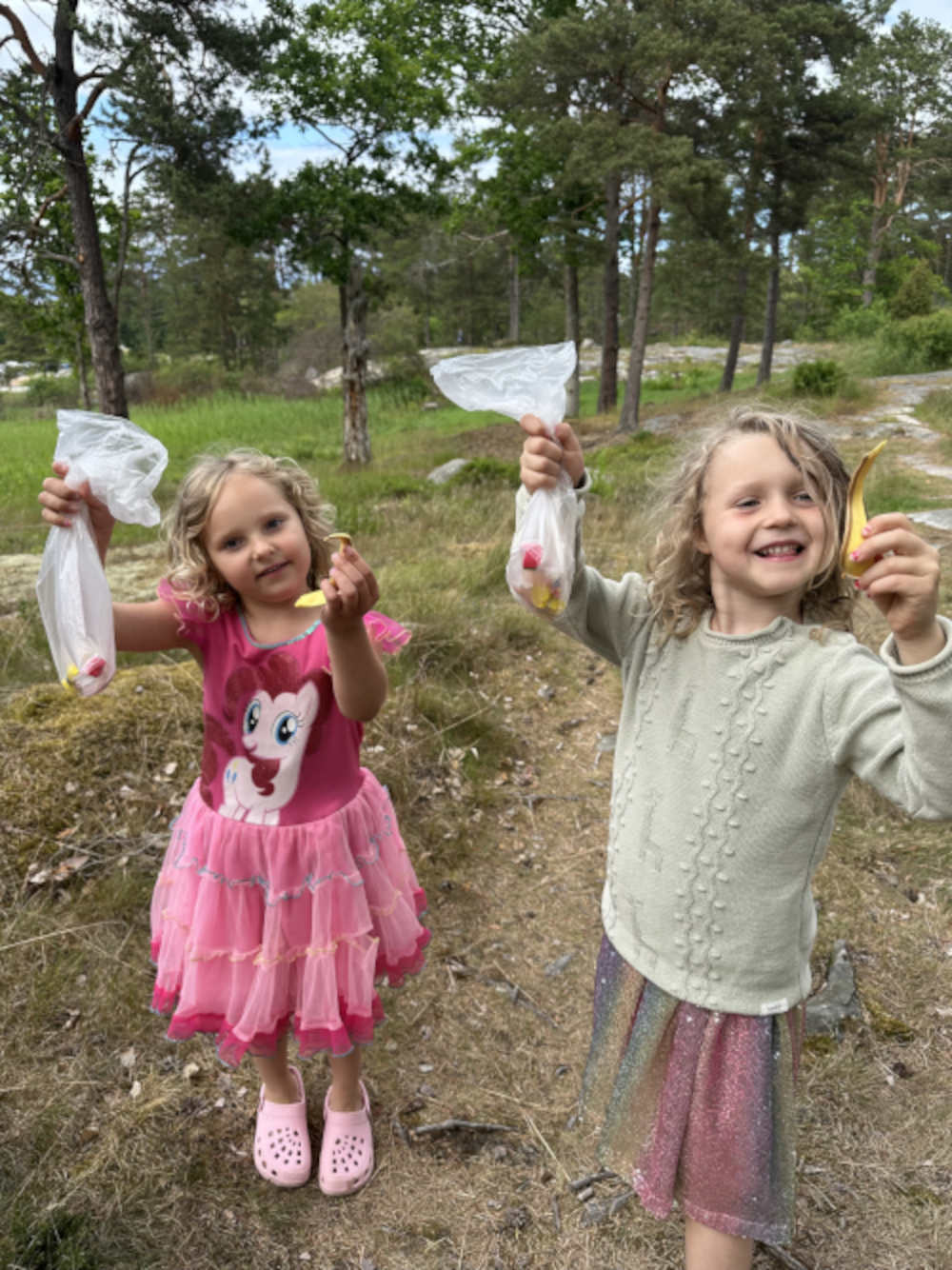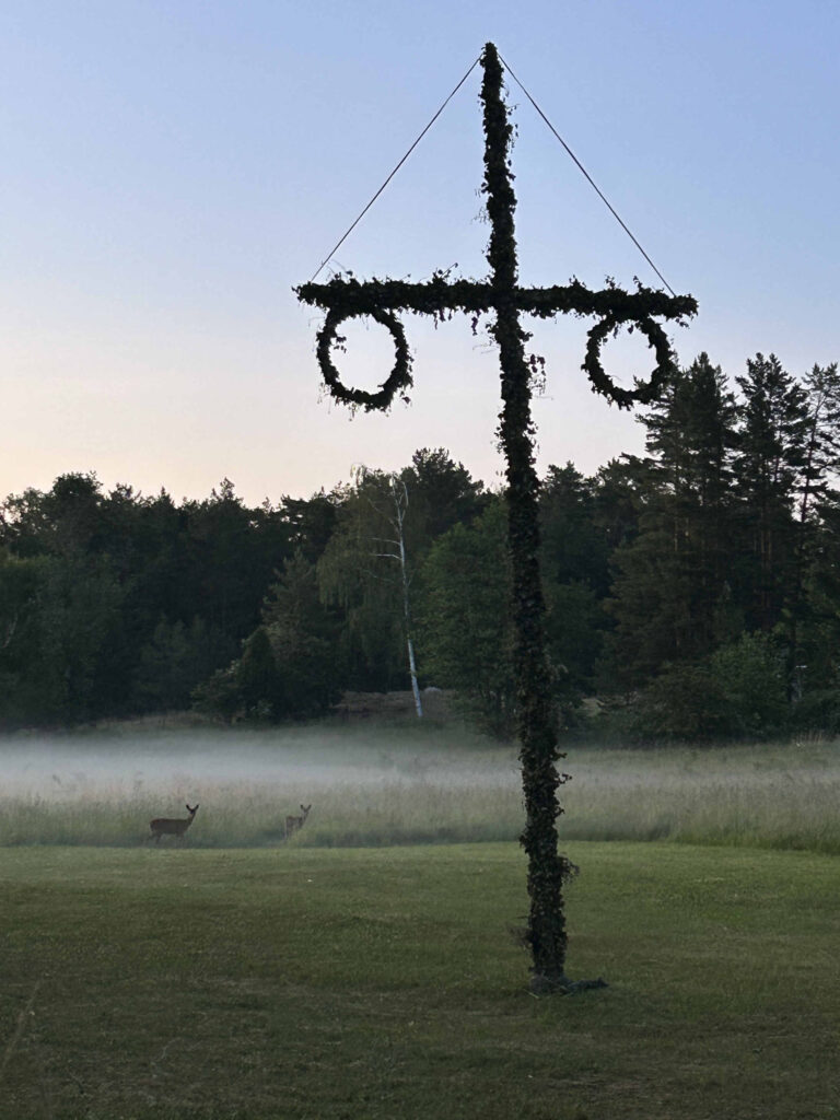 Redan klockan 10.00 hjälps vi åt att klä midsommarstången. Barn och vuxna samlar björkris och blommor från området och dekorerar stången inför eftermiddagens firande.